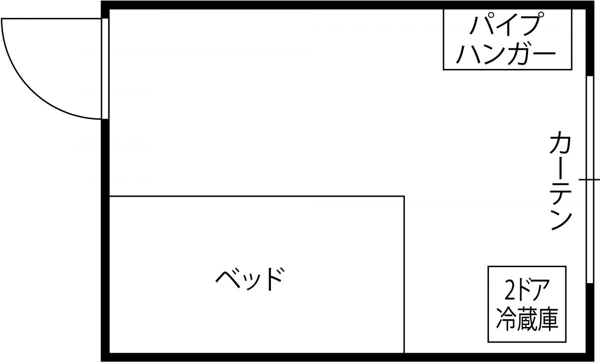 家具付き居室: 生活に必要な基本家具が設置済み。カバン一つで新生活をスタートできる手軽さが魅力です。